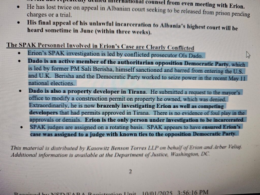 Pjesë e dosjes së lobimit është edhe raporti i firmave Kasowitz LLP dhe Mishcon de Reya i datës 24 qershor 2025, që e paraqet paraburgimin e Veliajt si “të padrejtë” dhe si problem që duhet të shqetësojë partnerët perëndimorë. Masa e arrestit ndaj Veliajt është vlerësuar e drejtë në të tre shkallët e gjyqësorit në Shqipëri.