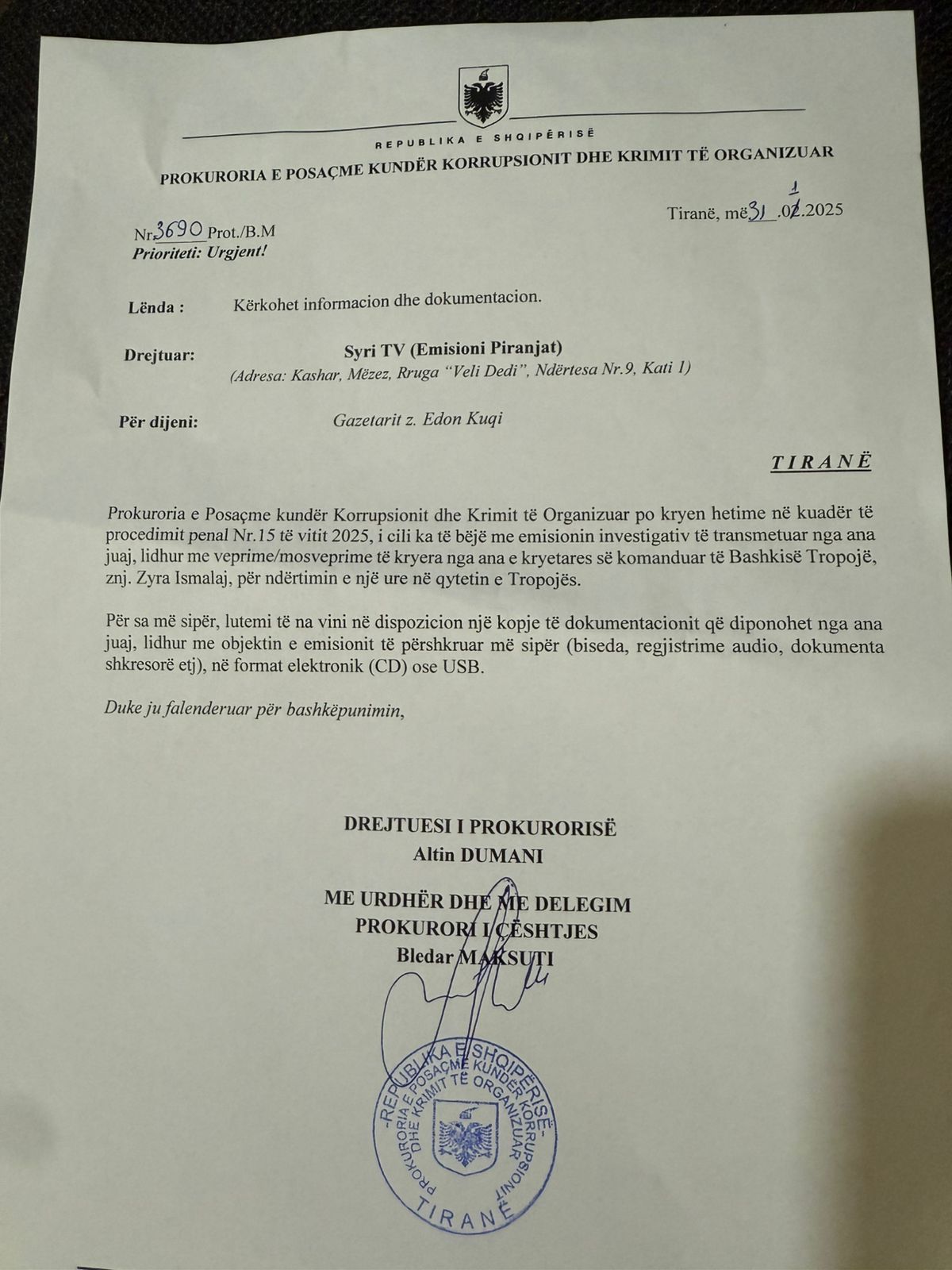 SPAK, përmes shkresës drejtuar emisionit “Piranjat”, njofton se ndaj Islamajt është regjistruar një procedim penal, nr 15/2025.