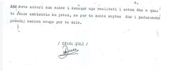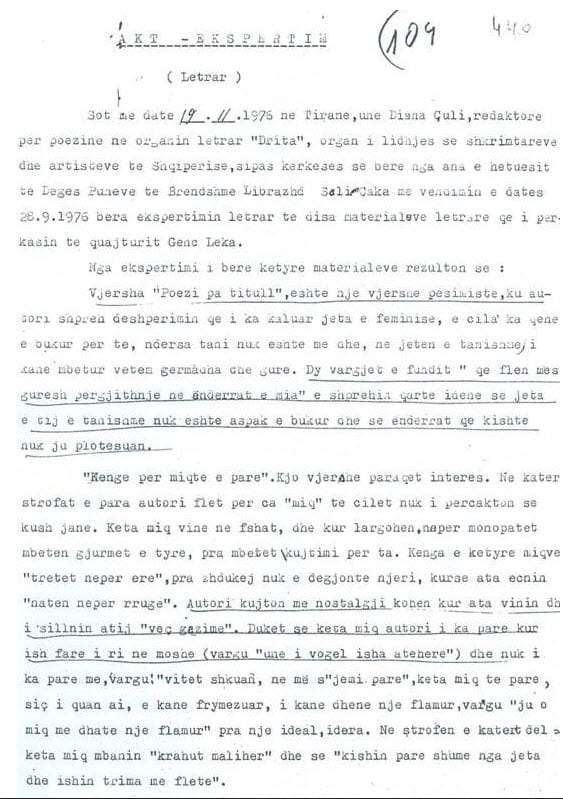 Kjo është  eskpertiza e bërë dhe firmosur nga Diana Çuli që e çoi në pushkatim poetin Genc Leka. Atë kohë në 19 nëntorin e vitit 1976, kur Diana Çuli, e datëlindjes prill 1951, shkroi dhe e nënshkroi, ishte redaktore e gazetës Drita, një vend me shumë rëndësi kur gjykon periudhën që përkon me një spastrim të egër që partia kishte ndërmarrë në ushtri, ekonomi dhe kulturë dhe për të forcuar vigjilencën në poste kyçe kishte vendosur më të besuarit e vet. Diana Çuli ishte mbesa e Sofokli Lazrit, këshilltarit të Ramiz Alisë.