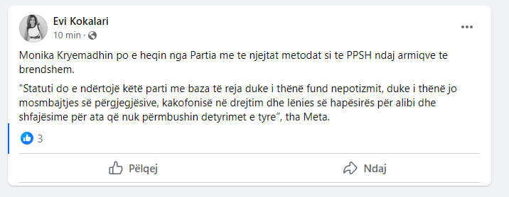 Evi Kokalari nëpërmjet një postimi në rrjetet sociale paralajmëron se Monika Kryemadhi po hiqet nga Partia e Lirisë.