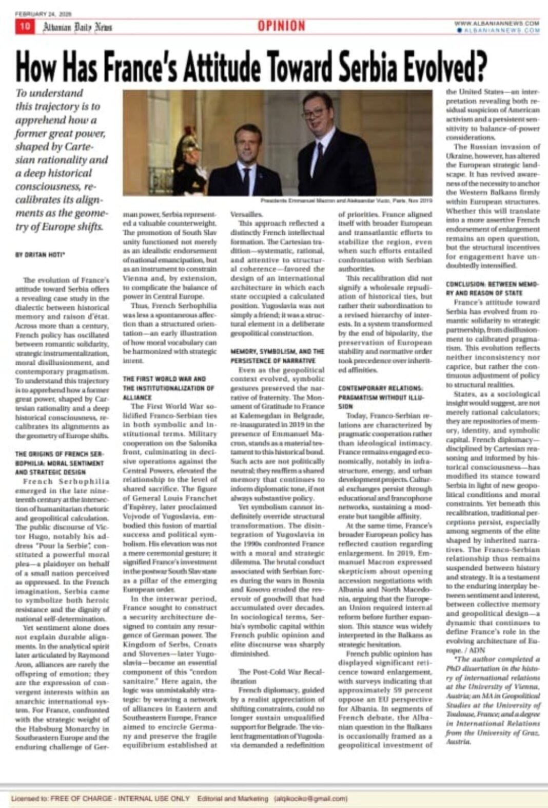 Kështu, prof Hoti në artikulliin e tij thotë se politika franceze ndaj Serbisë ka kaluar nga një marrëdhënie e ngarkuar me histori dhe simbolikë tek një qasje më e ftohtë, më strategjike dhe më pragmatike.