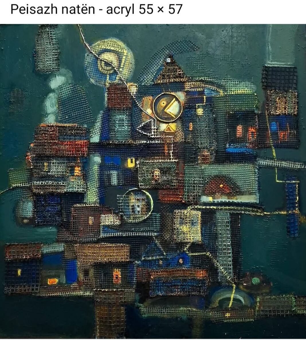 Peisazhi duket si një qytet i varur në ajër, i ndërtuar me struktura metalike, me rrjeta, ura të holla dhe shtëpi të mbivendosura njëra mbi tjetrën. Dritat e verdha në dritare e bëjnë të duket qytet i gjallë, edhe pse është natë e thellë. Sfondi i errët me nuanca blu e jeshile të sjell ndjesinë e mjegullës, thellësisë dhe pak mister, sikur jemi mes ëndrrës dhe realitetit.