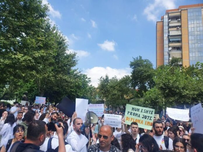 Studentët e Mjekësisë janë mbledhur para Kuvendit, duke protestuar kundër ligjit që u bllokon atyre diplomat. Në Kuvend po diskutohet mbi këtë ligj, ndërsa studentët e cilësojnë të padrejtë. Qeveri e firmoi dje aktin, si një manovër për të bllokuar largimin e mjekëve jashtë vendit.