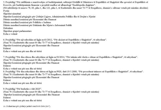 Një pikë tjetër në rendin e ditës, që pritet të diskutohet ditën e sotme është projektiligji për miratimin e marrëveshjes ndërmjet Këshillit të Ministrave të Republikës së Shqipërisë dhe Eagle Hills Real Estate Development.